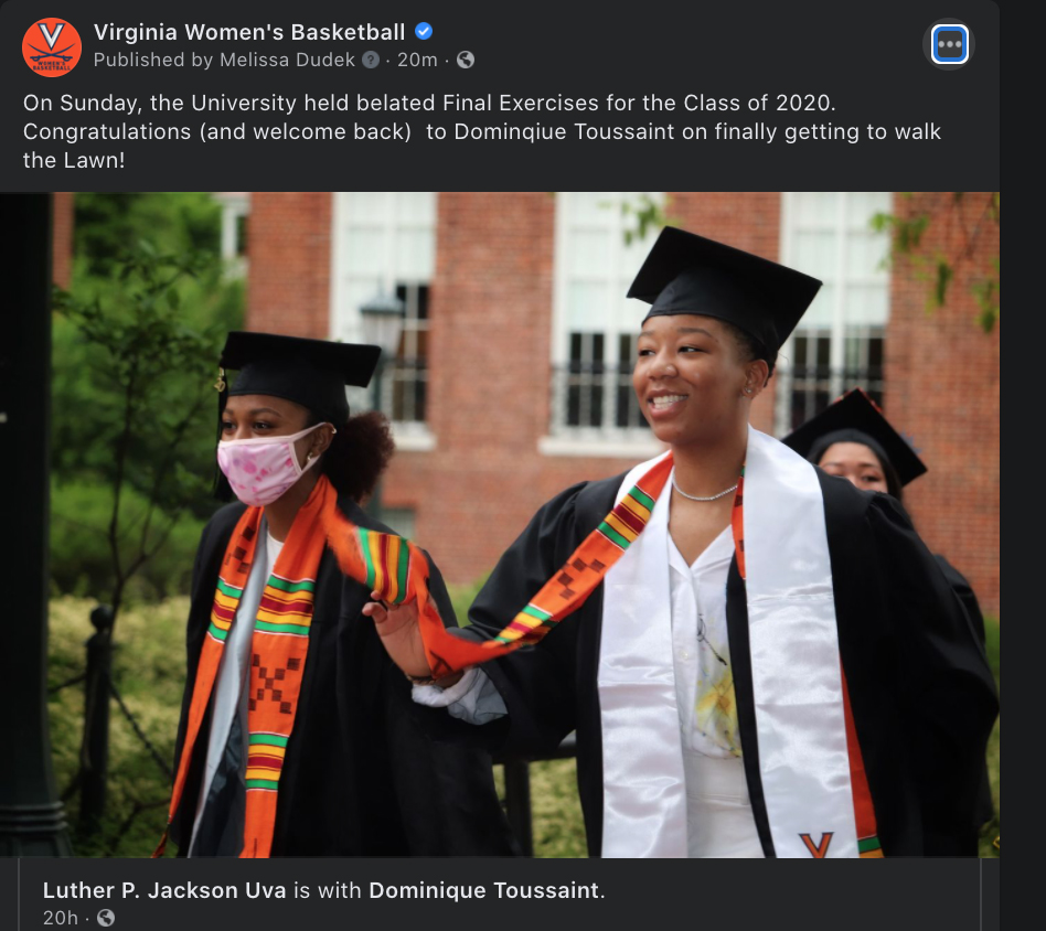 On Sunday, the Class of 2020 walked the Lawn before heading over to Scott Stadium to take part in their belated Final Exercises. It was great to see some very familiar faces back on Grounds getting to put the exclamation point on their STUDENT-athlete experience. Team and University social accounts were happily sharing photos of the joyous grads.
