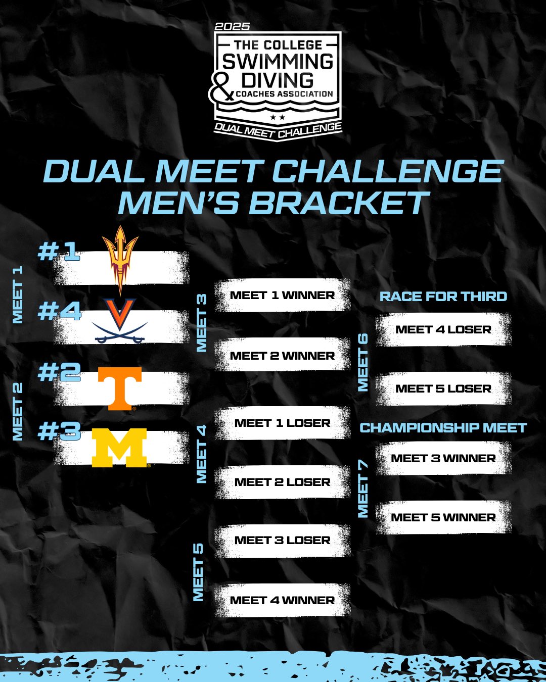 College Swimming & Diving Coaches Association is putting on this first-of-its-kind event showcasing top collegiate swimming programs in an innovative, four-team, double-elimination tournament with a head-to-head format. Participating teams include one team representing each of the Power 4 conferences: Tennessee (SEC), Michigan (Big Ten), Arizona State (Big 12), Virginia (ACC).