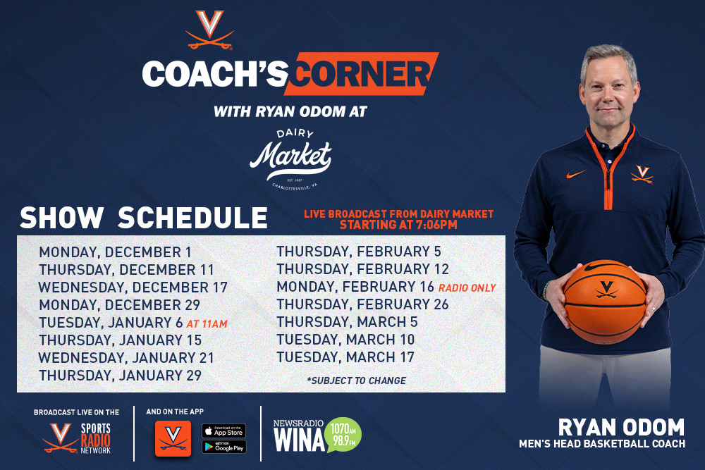 CHARLOTTESVILLE, Va. – Coach’s Corner with Ryan Odom debuts Monday (Dec. 1) at the Dairy Market, Charlottesville’s Premier Food Hall (946 Grady Ave). The weekly radio show is set to air from 7-8 p.m., and is hosted by John Freeman, the “Voice of the Cavaliers.”