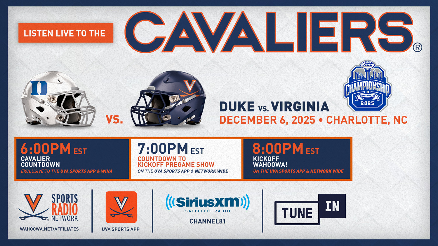CHARLOTTESVILLE, Va. – In pursuit of its first outright ACC championship and possible berth in the College Football Playoff, No. 16/17 Virginia (10-2, 7-1 ACC) takes on Duke (7-5, 6-2 ACC) in the 2025 Atlantic Coast Conference Championship game Saturday night (Dec. 6). The 21st edition of the ACC Championship is set to air in primetime at 8 p.m. on ABC, the Virginia Sports Radio Network and ESPN Radio.